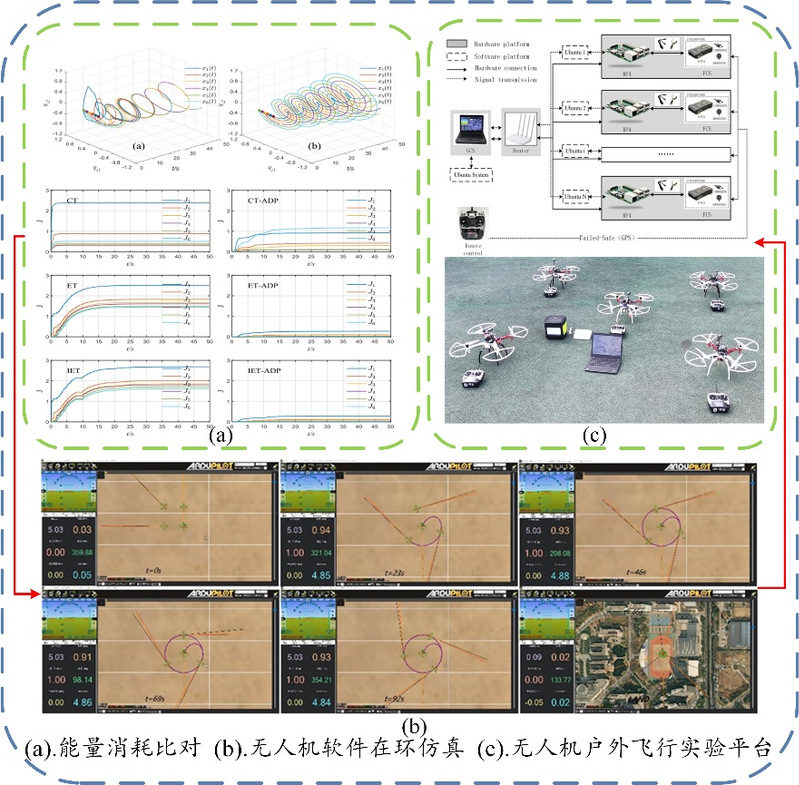 “结合自适应动态规划(ADP)和强化学习算法,研究了一种基于间歇事件触发策略(IET)的多智能体系统平均一致性问题。设计了一种新的间歇事件触发条件,并建立了相应的分段微分不等式。利用所建立的不等式,得到了几个关于平均一致性的重要准则。在此基础上,继而研究了多智能体系统的最优一致性策略,并导出了纳什均衡意义下的最优间歇事件触发策略和相应的局部Hamilton–Jacobi–Bellman方程。最后,给出了最优策略的自适应动态规划及Actor-critic算法的数值实验。和单一的IET或ADP算法相比,IET-ADP的融合策略在节省系统能量方面具有明显优势。所设计的IET-ADP算法实现了事件触发机制和ADP算法的协同配合效应。此外,间歇事件触发策略的模型构建,对多智能体系统的稳定性研究具有重要作用,该方法还可推广应用于无人系统的智能控制和协同编队任务中。因此,课题组借助树莓派电路板、地面站、飞控等硬件及一系列软件搭建了户外无人系统飞行实验平台,并将设计好的控制算法部署到四旋翼无人飞行器的编队任务中,构建了一套从理论分析到数值模拟、软件在环再到实机应用的研究闭环。”