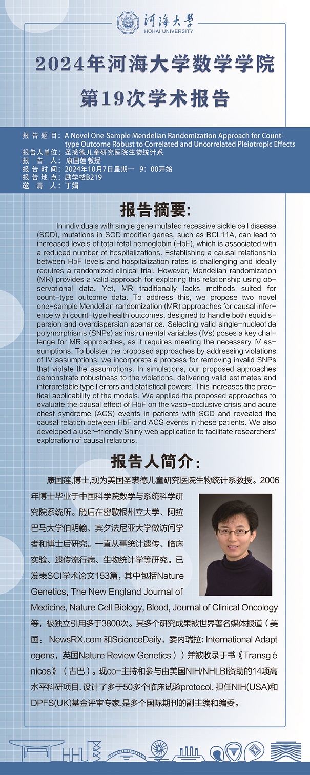 数学学院第19次学术报告:A Novel One-Sample Mendelian Randomization Approach for Count-type Outcome Robust to Correlated and Uncorrelated Pleiotropic Effects
