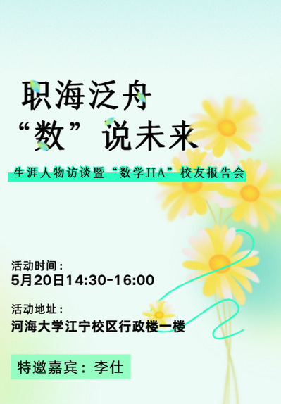 为帮助学生明确职业方向,提升生涯规划意识,5月20日,我院举办了“职海泛舟,‘数’说未来”——生涯人物访谈暨“数学JIA”校友报告会,活动邀请义乌市IP产业协会常务副会长、杭州羽克电子商务有限公司董事长李仕校友分享创业经验和生涯故事,学院党委书记潘静、叶国菊教授、学生代表70余位出席报告会,会议由院团委书记张添烨主持。本次报告会为在校生搭建了与校友对话的桥梁,展现了数学专业的广阔前景。
