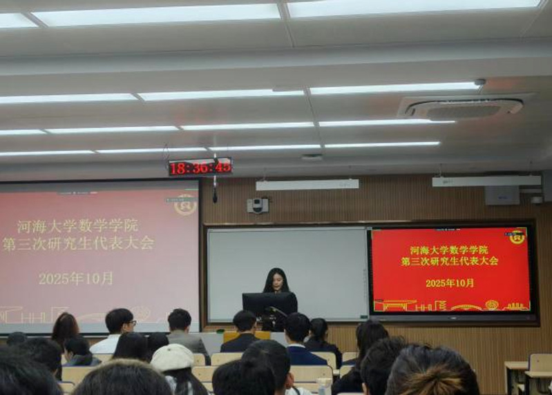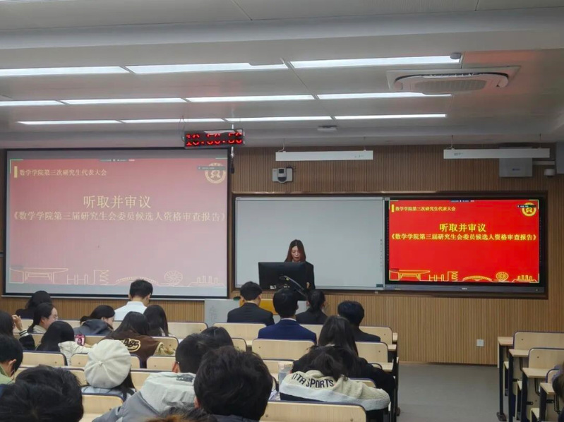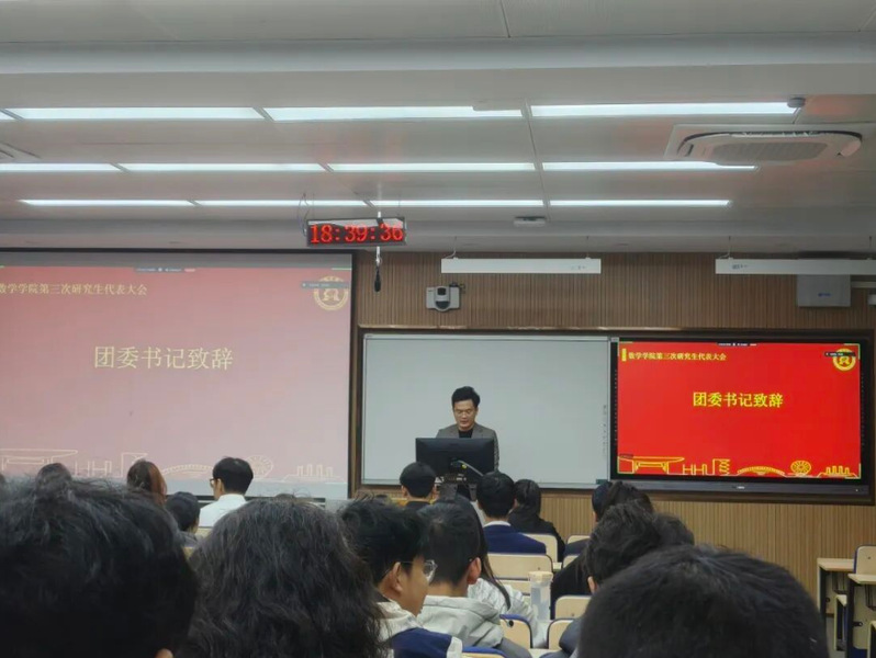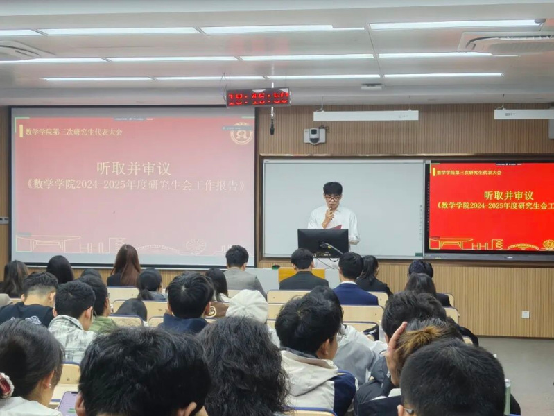 近日,我院第三次研究生代表大会在江宁校区致用楼218顺利召开,会议采用线上与线下相结合的方式进行。数学学院团委书记兼研究生辅导员张添烨老师、数学学院2024-2025年度研会所有成员及各年级75位研究生代表出席本次会议,会议由研究生会邹逸瑾同学主持。