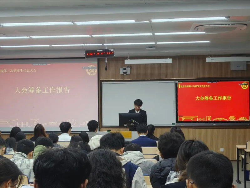 随后,大会听取了院实践部部长钟林洲所作的《数学学院第三次研究生代表大会筹备工作报告》。报告阐述了筹备委员会的工作、研究生代表产生办法以及第三届研究生会委员候选人条件。