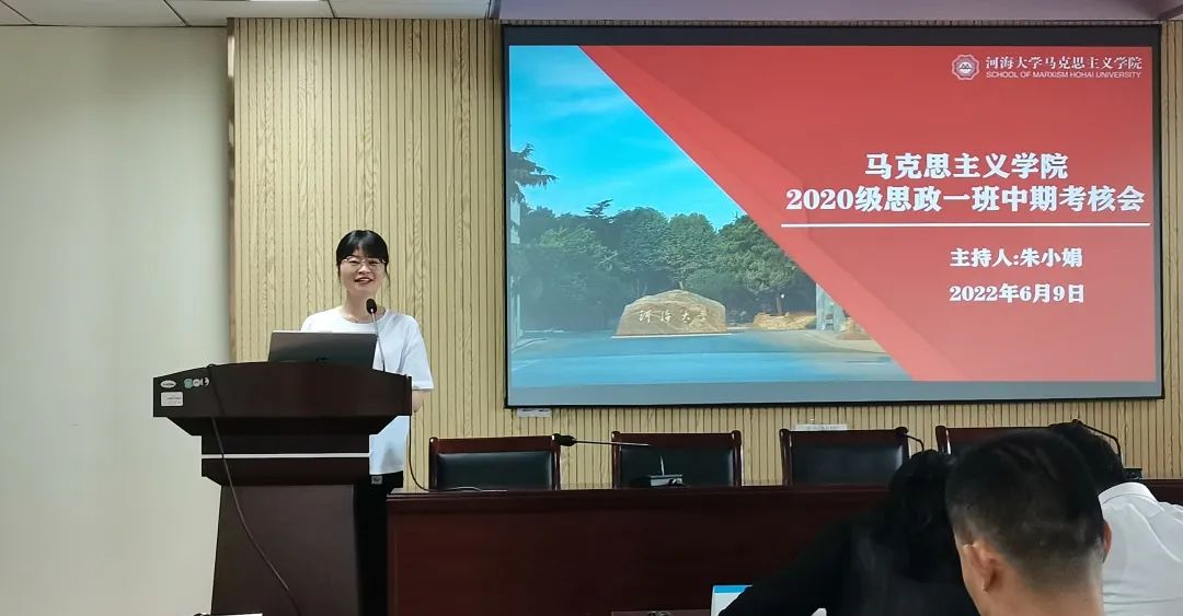 活动共分三个阶段。第一阶段,全体教师和学生集中开会。首先,由班导师朱小娟老师介绍与会教师和活动安排。接着,由李宁老师致辞,向同学们介绍了中期考核的目的与意义,并以老教师、老校友的故事鼓励同学们投身专业学习。随后,班长颜双喜就班级情况做汇报,介绍了20级思政一班两年的班级建设,并对班级未来的发展做出展望。