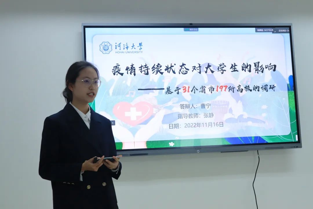 第五位进行答辩的是曹宁同学,他们团队项目名称是《疫情持续状态对大学生的影响——基于31个省市197所高校的调研》。他们关注疫情持续三年之久这一特殊的社会背景和现实状态对大学生带来的各种影响,从党、国家、高校、大学生四个层面多维度、多学科地进行评估处理,并对项目进行系统规划,提出未来愿景。