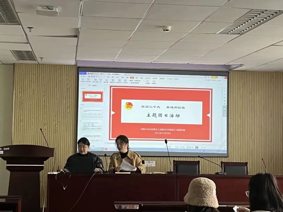 为深入学习贯彻党的二十大精神,推动党的二十大精神学习往深里走、往实里走、往心里走,进一步引导团员青年统一思想、凝聚共识,切实增强团员的政治意识、组织意识和模范意识,加强新时代团的基层组织建设,马克思主义学院硕士二年级一班团支部于2022年11月28日14:00在厚学楼1208召开“学习二十大,永远跟党走,奋进新征程”主题团日活动,支部成员积极响应,学习宣传贯彻党的二十大精神。