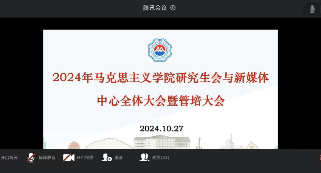 2024年10月27日,2024届马克思主义学院研究生会和新媒体中心在腾讯会议召开了第一次全体大会暨管培大会。本次会议旨在提升马克思主义学院研究生会和新媒体中心工作人员的热情与主动性,增进集体的凝聚力和向心力。会议由研究生会组织部负责人杨木子主持,学院团委书记、研究生辅导员张洁老师及2024届研究生会和新媒体中心全体成员参加。
