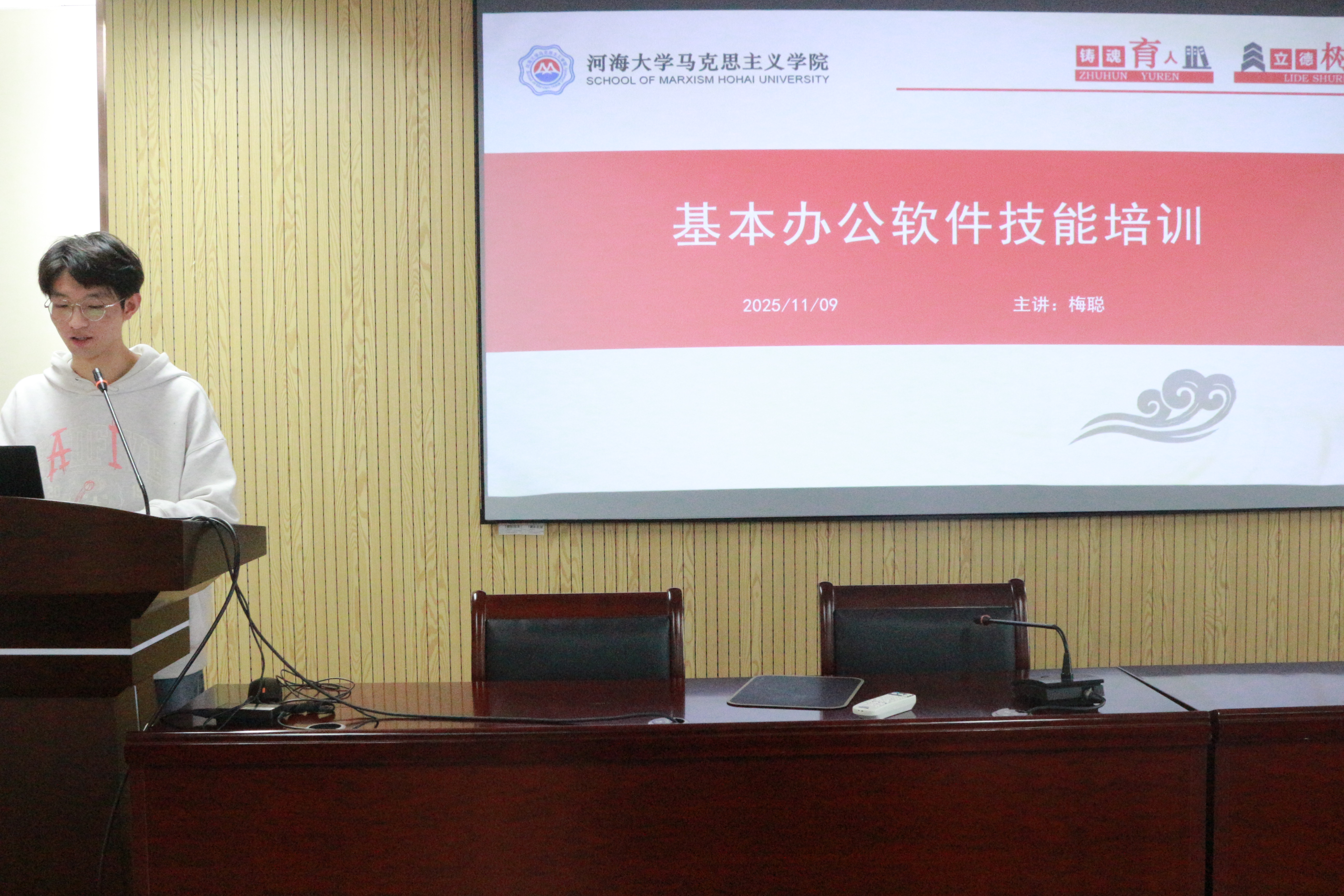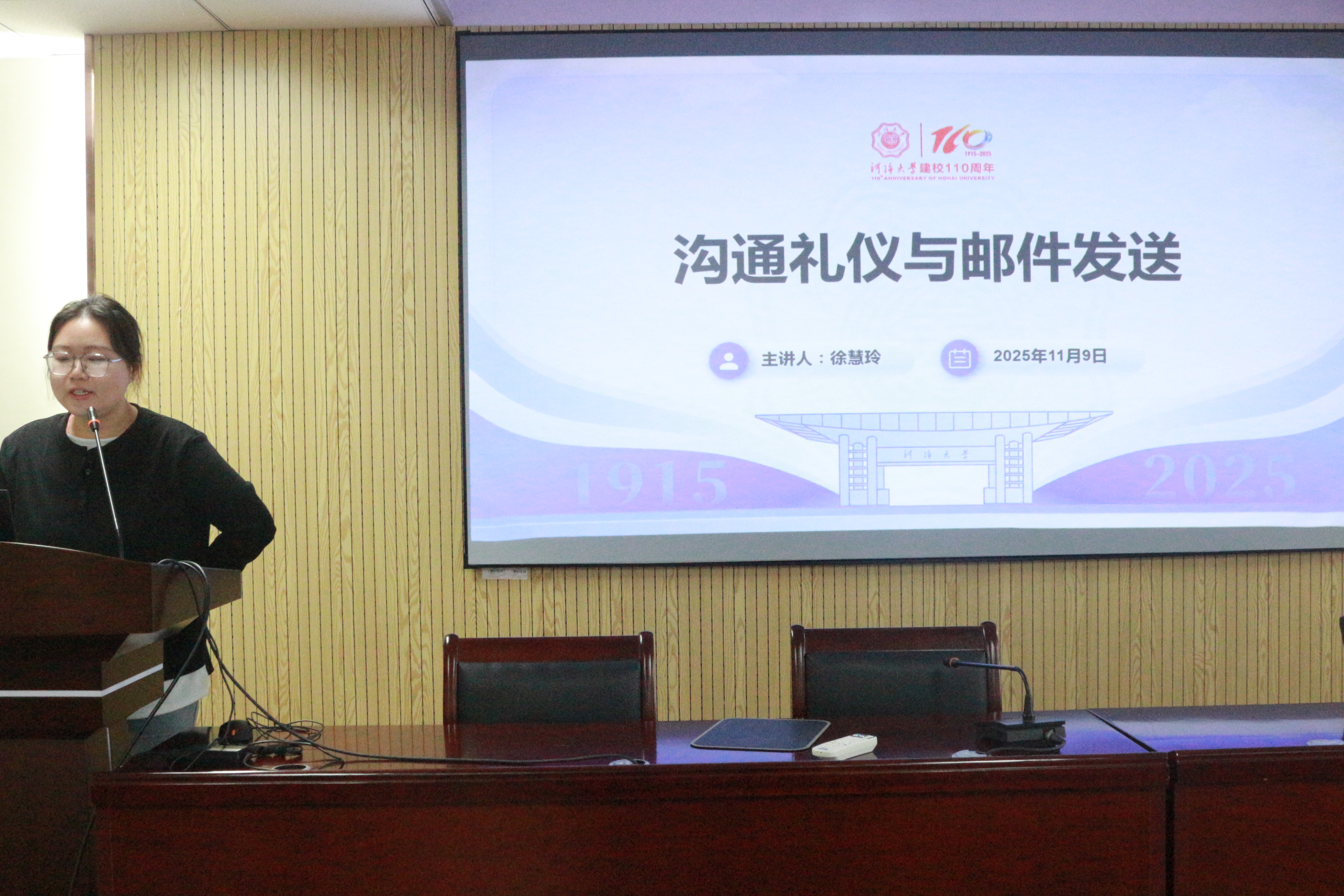 新媒体中心副主任徐慧玲对沟通礼仪及邮件发送进行培训。在沟通礼仪方面,她分别从对老师、学长学姐和对同学两个方面讲述了沟通的技巧与应有的礼仪。在邮件发送方面,她指出应当规范邮件标题、称谓与问候手法,明确邮件正文与内容、签名格式,并对其中的要点进行解释说明。
