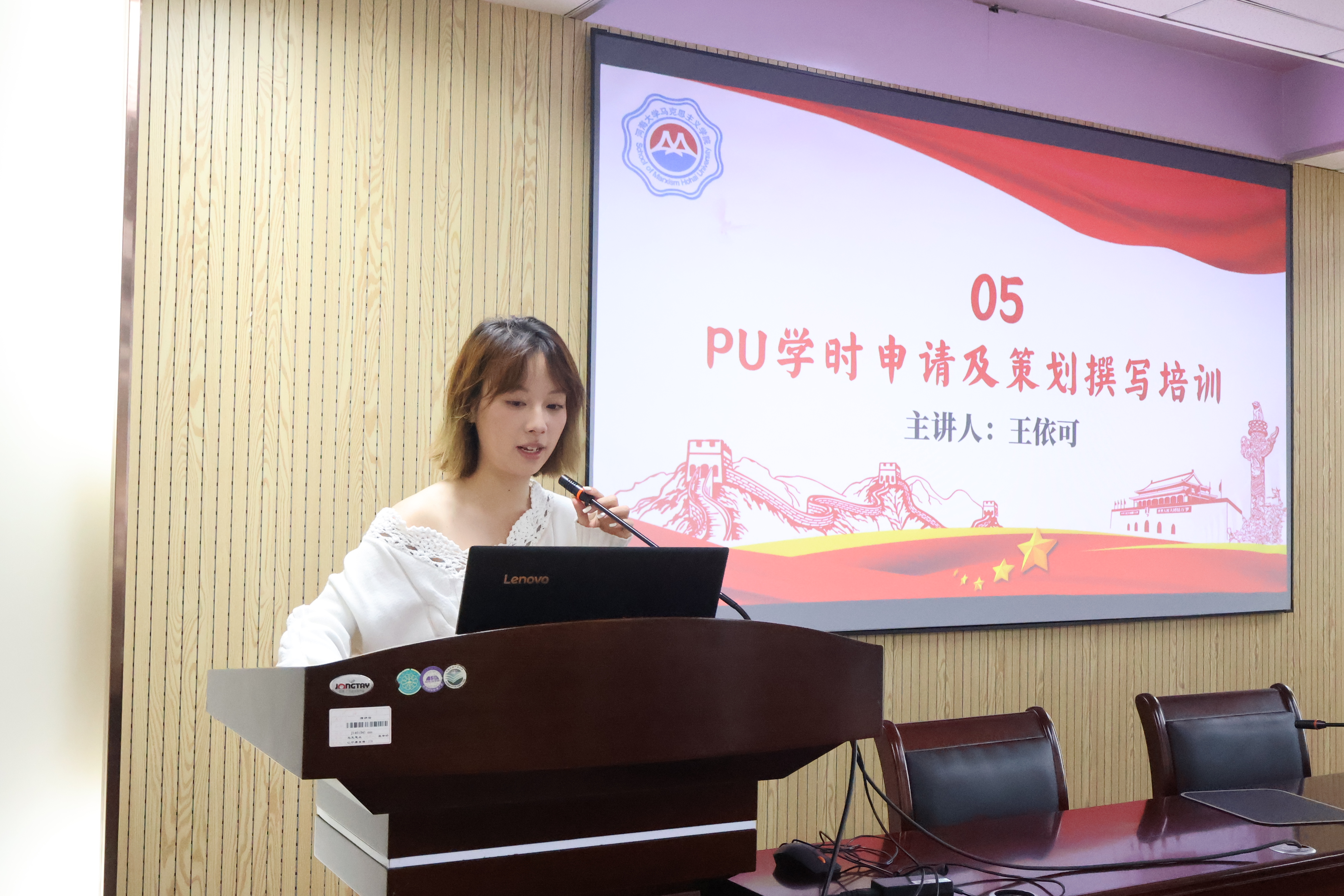 团委组织部部长王依可为成员们培训PU学时申请和策划案撰写。首先,她介绍素质拓展学时的分类与院活动的组织与开展。其次,对于策划案撰写,她介绍了从活动背景目的、活动发起、签到签退、活动完结的各项流程,列举了注意事项,并强调申请PU需要瞄准具体信息。