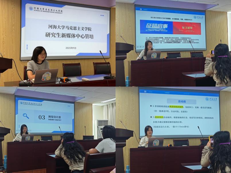 2025年9月21日晚7点,马克思主义学院新媒体中心在厚学楼1208开展了招新后第一次培训活动。此次培训由主席团成员、新媒体中心副主任丁乐妍主持,视觉设计部部长赵星昱记录整理会议内容。