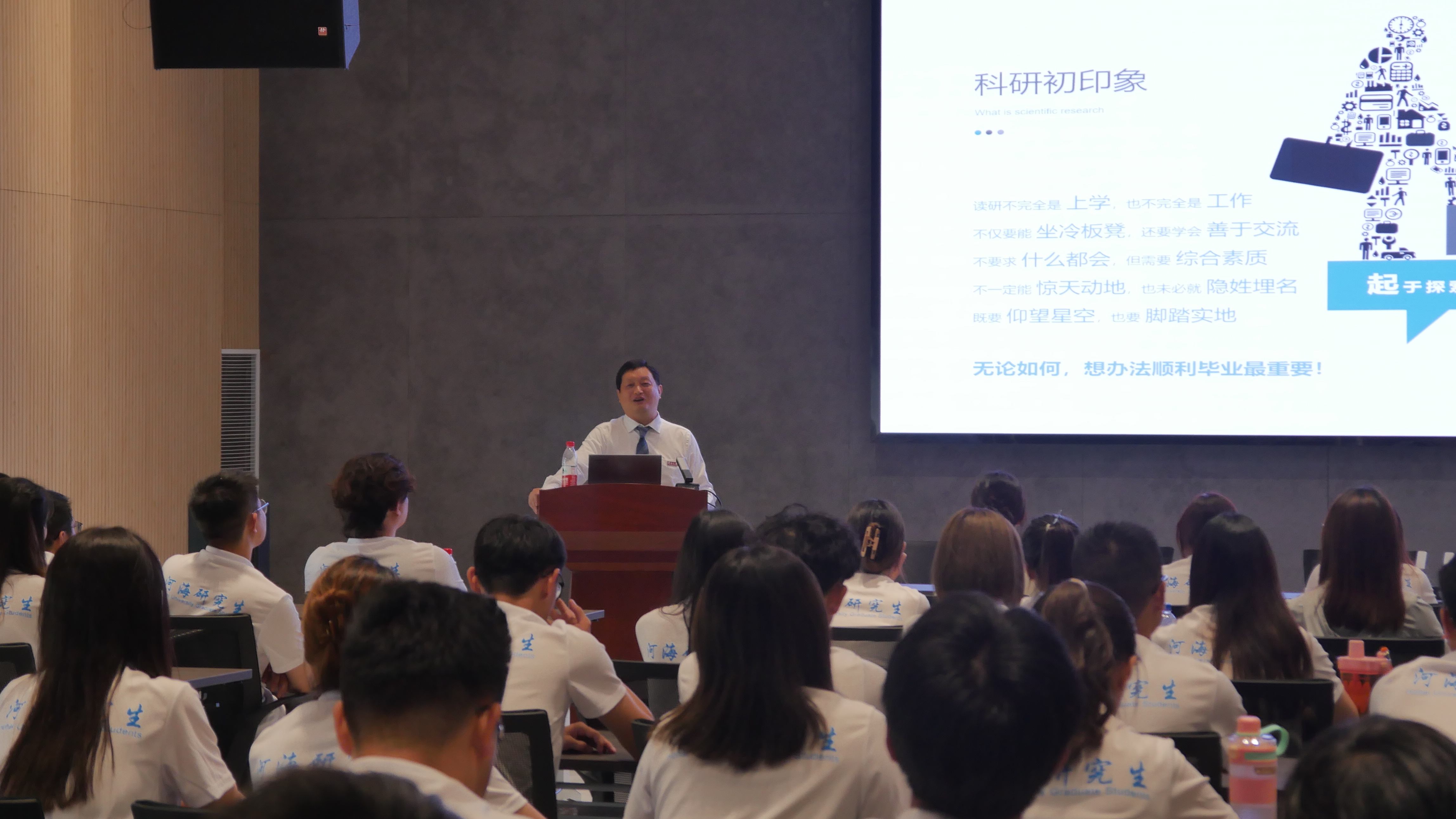 典礼最后,雷冬院长为全体23级研究生新生上了开学第一课。他主要从专业发展历程和应用方向方面向同学们介绍,同时他悉心教授同学们开展科研过程中的方法。最后他寄语同学们愿他们成长为志存高远、脚踏实地、勇攀科技高峰的新时代“水之子”!