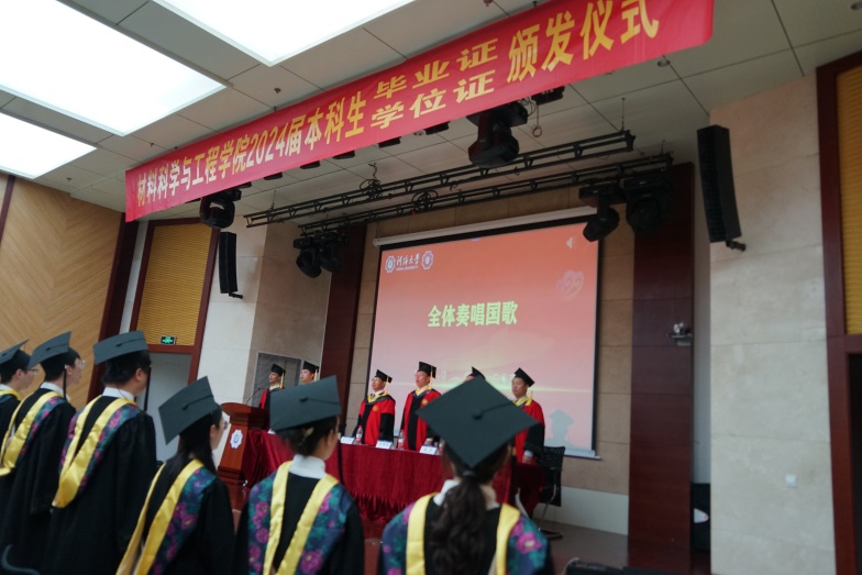 全场肃立,齐声高唱国歌。材料科学与工程学院2024届本科生毕业典礼暨学位授予仪式在庄严嘹亮的国歌声中正式拉开帷幕。