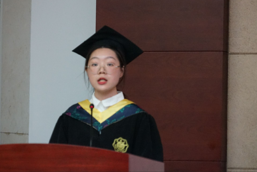 毕业生代表冯颖表达了对母校、院领导和老师们的崇高敬意和衷心感激之情。她表示,作为新时代青年,肩负着新时代的重任,更应不负时代、不负韶华,将带着母校的期望、老师们的教诲、朋友们的鼓励,砥砺前行,做怀揣梦想、脚踏实地的人,做德才兼备、敢挑重任的人。