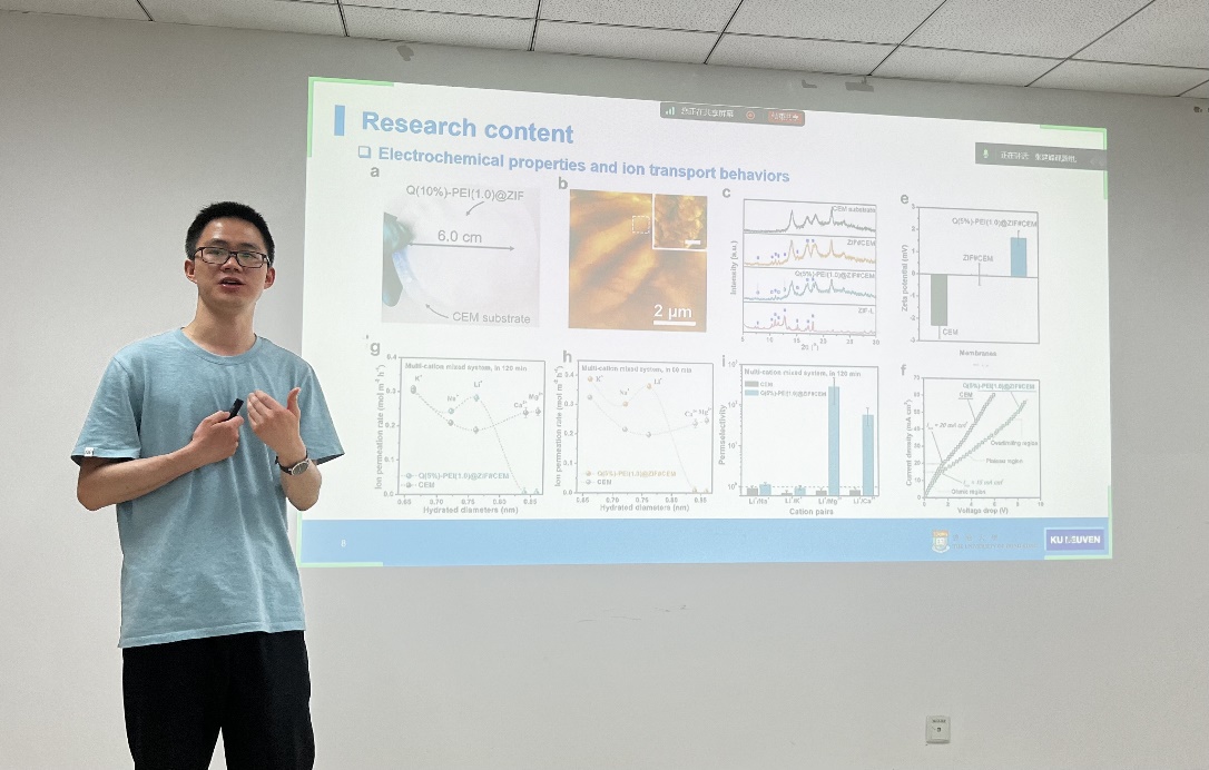 赵严博士以“Electric field-assisted ion control in membrane fabrication for lithium recovery”为题,提倡利用具有精确离子传输和分离性能的膜从盐湖回收锂来解决锂短缺并减少矿物开采对环境的影响,但其Li+选择性不足限制了应用。赵严博士提出通过电场辅助离子控制设计高效Li+选择性膜。利用聚乙烯亚胺的原位转化和2,3-环氧丙基三甲基氯化铵的季铵化,在阳离子交换膜上构建咪唑酸分子筛骨架层。
