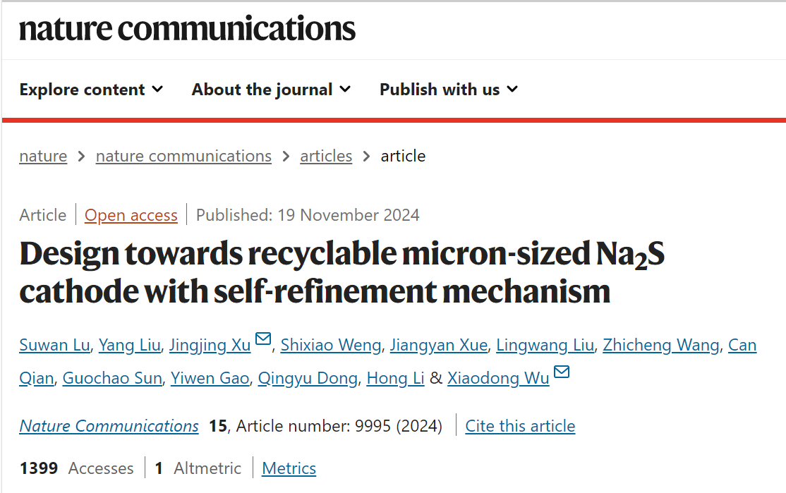 近日,我院许晶晶研究员以共同通讯作者身份在国际知名期刊《Nature Communications》上发表了题为“Design towards recyclable micron-sized Na2S cathode with self-refinement mechanism”的研究性论文。中国科学院苏州纳米技术与纳米仿生研究所吴晓东研究员为论文共同通讯作者。