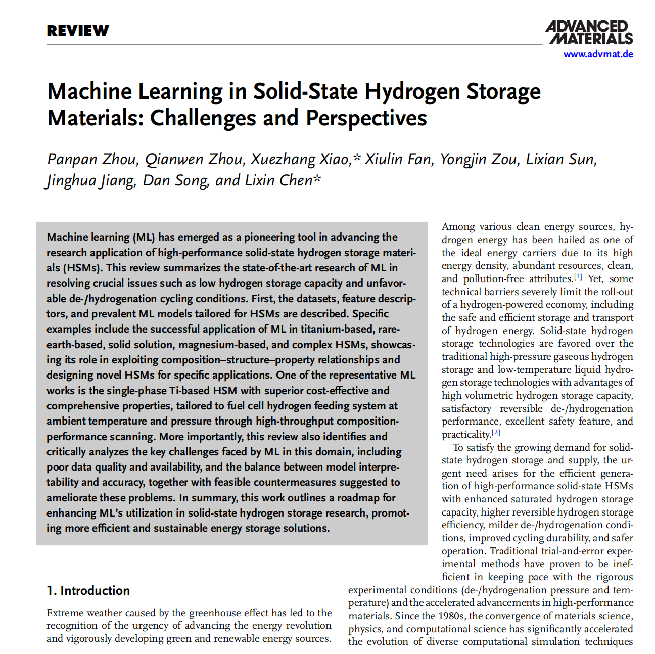近日,我院青年教师周盼盼以第一作者身份在材料领域顶级期刊《Advanced Materials》上发表了题为“Machine Learning in Solid-State Hydrogen Storage Materials: Challenges and Perspectives”的综述长文(非邀稿),开云电竞网为第一单位,浙江大学陈立新教授和肖学章教授为论文的共同通讯作者。(https://doi.org/10.1002/adma.202413430)