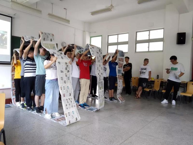 令人印象最深刻的就属“连接你我”和“叠纸”游戏啦。连接你我游戏中,每个人发一张彩色的方格纸,在纸上写下自己的姓名、家乡、爱好以及座右铭等等,完成之后,拿着相同颜色纸张的同学相互交换,以此来进一步地了解。之后的“叠纸”游戏更加动人心魄,每班均分几组,每组各发一张大纸,小组成员出谋划策,想出折叠纸张的好方法,之后全组人员互拥在一起,站在纸上不偏不倒,最终折叠次数最多的即为胜者。