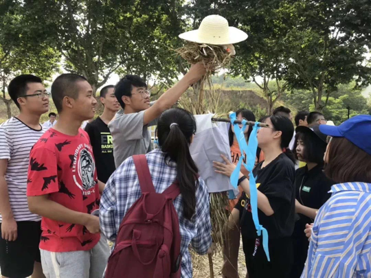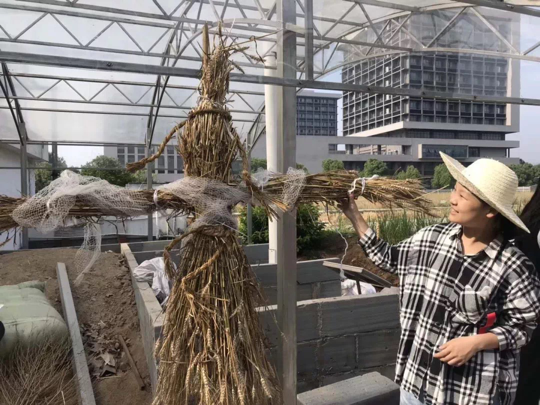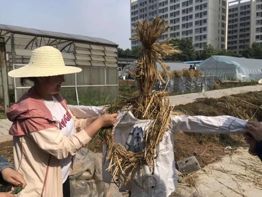 在进行割麦体验的同时,部分同学在麦田旁开展了稻草人制作活动。同学们以班级为单位,就地取材,利用竹竿、麦秆等基本材料编织稻草人,并搭配上草帽、衣服等装饰。制作完成后,各班同学将各具特色的稻草人立在了田间,守护我们的农田。