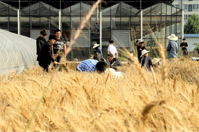 割麦体验赛正式开始,各组成员进入麦田抢收麦子。同学们经过小心翼翼地尝试后,很快进入了有条不紊的收割状态。现场气氛紧张活跃,不少未能参加比赛的同学都忍不住进入麦田进行体验。比赛结束后,国洪梅老师对各组收割麦田的表现进行点评,她对同学们劳动实践的热情表示了肯定。徐俊增副院长对此次活动进行了总结,希望同学们能够通过劳动实践亲近土地、熟悉土地、热爱土地,为以后深入的专业知识学习打下良好的实践基础。