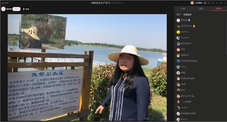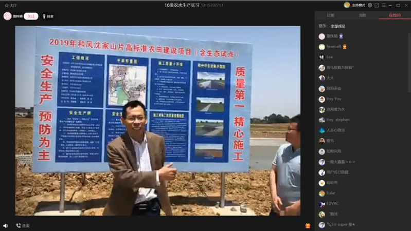 本次线上实习直播教学内容包括和凤镇高标准农田建设工程、和凤镇塘坝清淤工程、环山河水利工程、章西圩排涝泵站工程、大新塘河道整治工程、方便灌区河道整治工程、三堡排涝工程、浙江省灌溉试验中心站-江东农水试验基地、铜山源水库灌区等。实习教师亲赴实习现场,以网络连通千里,用摄影镜头带领学子“身临”工程实景。线上直播,实习教师变身“网红”主播,连线大咖,工程专家成为“特邀”嘉宾,通过现场讲解工程的建设目的、建设内容、设计方案、施工情况、建设现状、管护措施、预期成效等内容,生动地介绍了实际工程案例和施工经验教训,讲授了工程建设过程中应用到的新理念、新技术,并在线解答同学们提出的问题,带来一场场内容充实、形式新颖的生产实习直播课程。