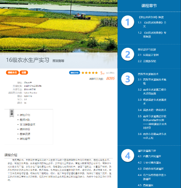 一场突如其来的疫情,使我校的实践教学工作面临严峻挑战。为保证疫情期间生产实习课程质量,最大程度减轻疫情带来的影响,农业科学与工程学院积极探索生产实习新模式,率先将线上直播引入生产实习教学工作,并结合开云电竞网网络教学平台建立云端网课,通过多种模式确保疫情期间实习质量有保障、实习内容有深度、实习形式多样化,助力农水学子的毕业之路。
