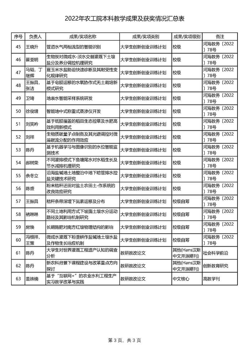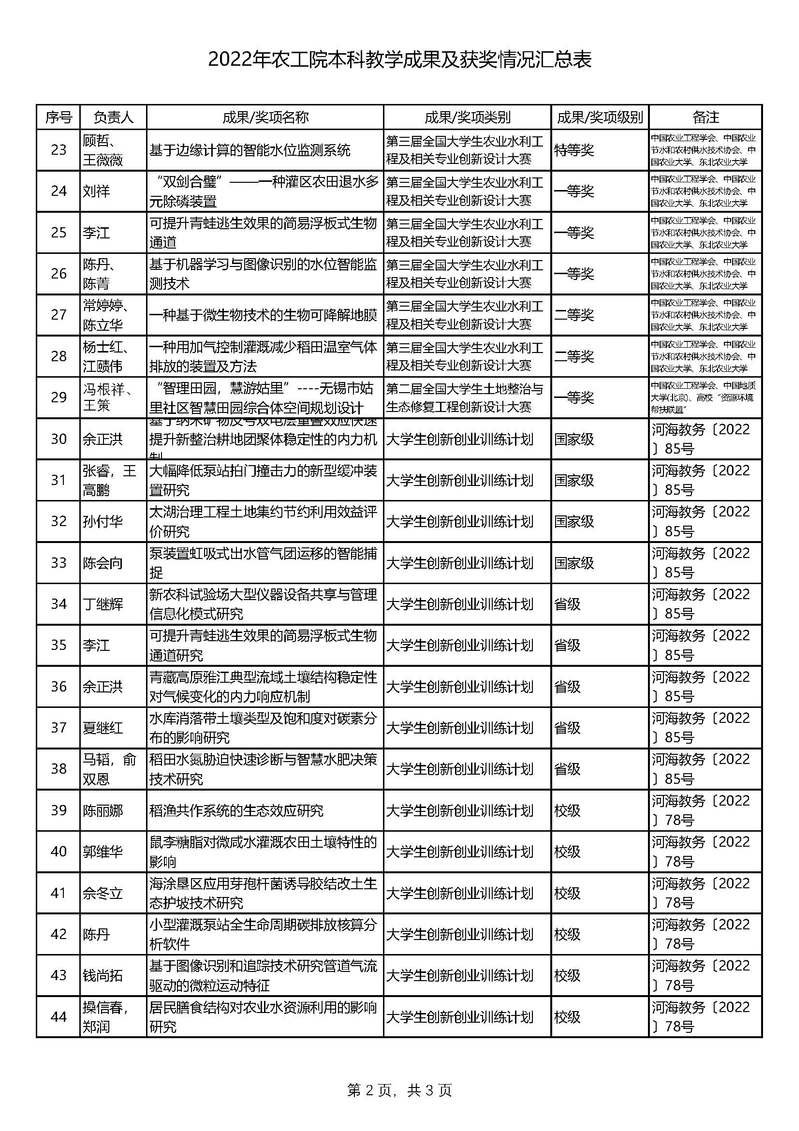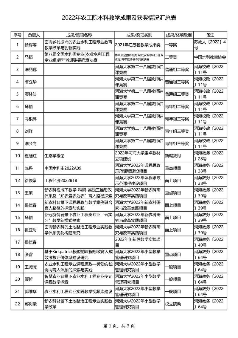 2022年农工院本科教学成果及获奖情况汇总表