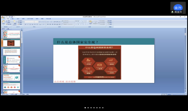 为提高大学生对国家安全的认识,建立一套理性的,符合时代特征和国家需求的教育框架,进而准确全面认识国家安全问题,树立正确的国家利益观。水利水电学院2019级的同学们以班级为单位,于2020年4月15日在线上开展了“同上一堂国家安全教育课”主题云班会,一起交流分享观看“同上一堂国家安全教育课”的感悟。