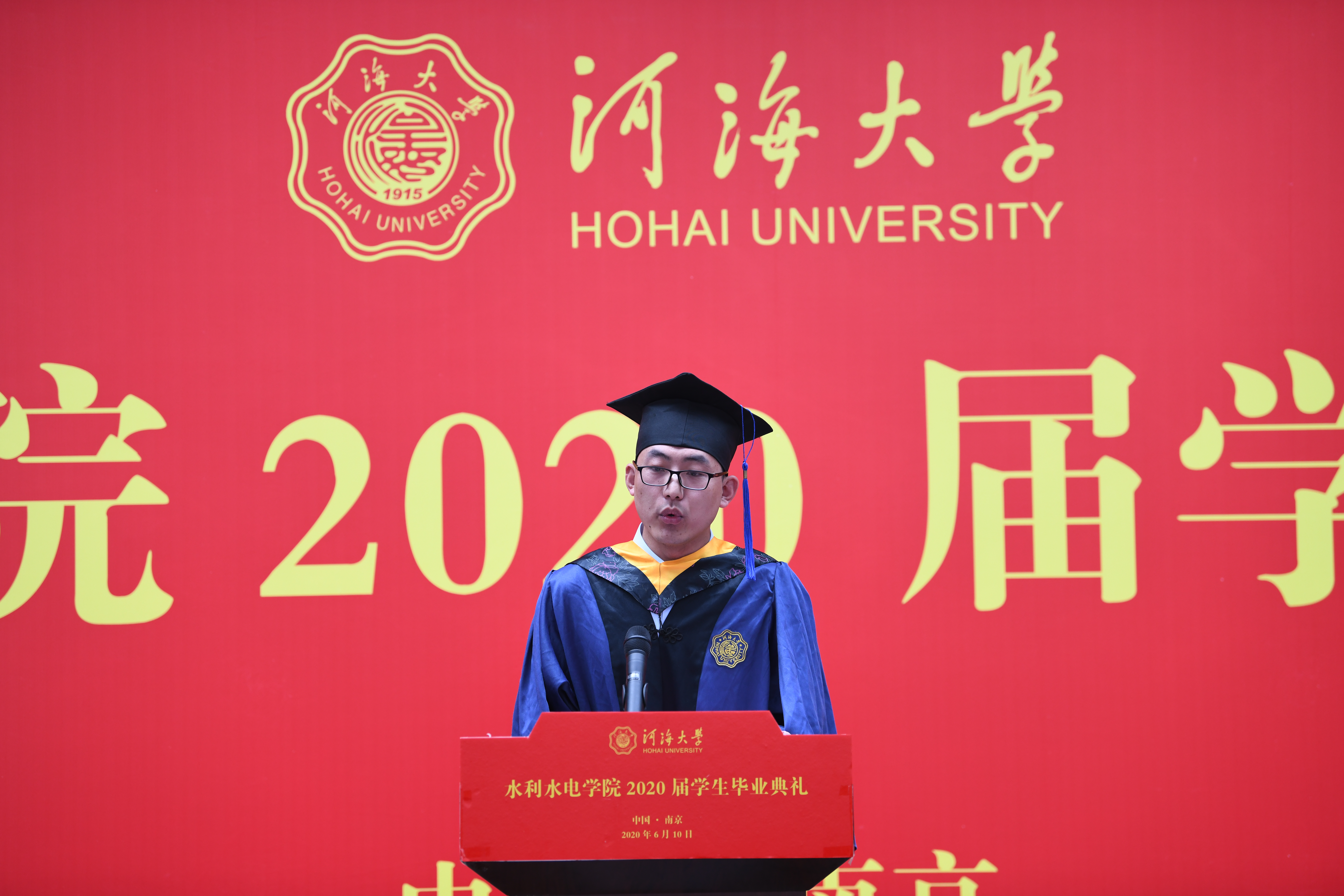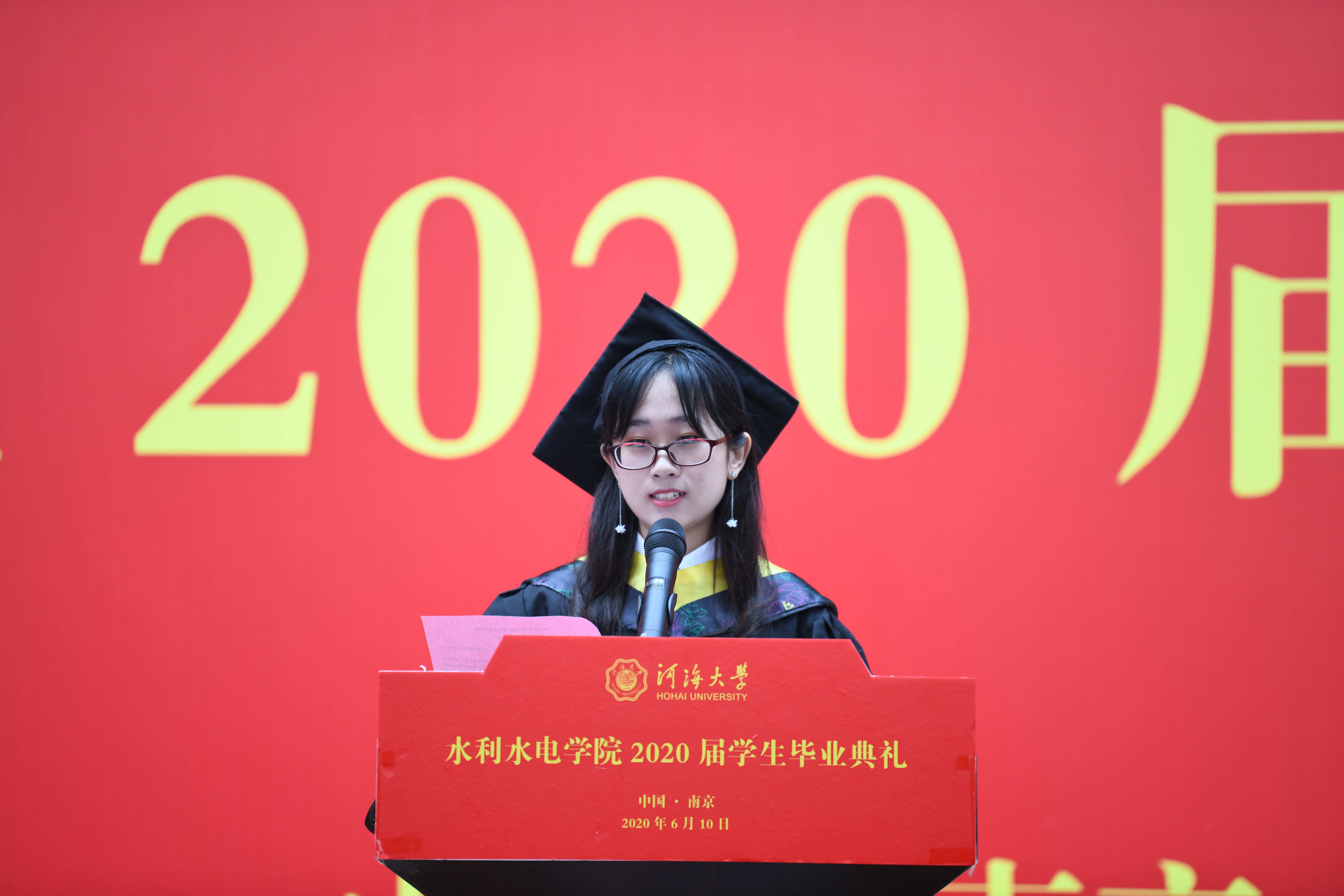 毕业研究生代表孔维民、本科毕业生代表贾其萃向母校、学院和老师们致以崇高的敬意和衷心的感谢。毕业生代表回忆了导师的循循善诱、老师的谆谆教诲、辅导员的句句叮咛、同学们的心心相印。同时他们表示,将始终牢记为中国水利事业贡献力量的初心,带着家国天下的情怀和为理想不懈奋斗的满腔热血,以只争朝夕的精神投身新时代,一展河海水利人的智慧与风采!