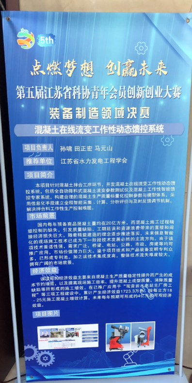 11月14日,第五届江苏省科协青年会员创新创业大赛装备制造领域决赛在南京工程学院天印会议中心学术报告厅举办。我院教师孙啸、田正宏和学生马元山的团队项目“混凝土在线流变工作性动态馈控系统”经江苏省水力发电工程学会推荐,获得装备制造领域创新组优秀奖。