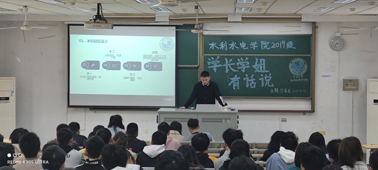 2021年4月13日下午,水利水电学院2019级本科生举办了“学长学姐有话说”学风建设主题分享会,邀请2017级优秀的学长学姐温家宣、闫致远、李柯雅分享学习经验、发展路径,2019级全体同学参与,辅导员帅雨婷出席。