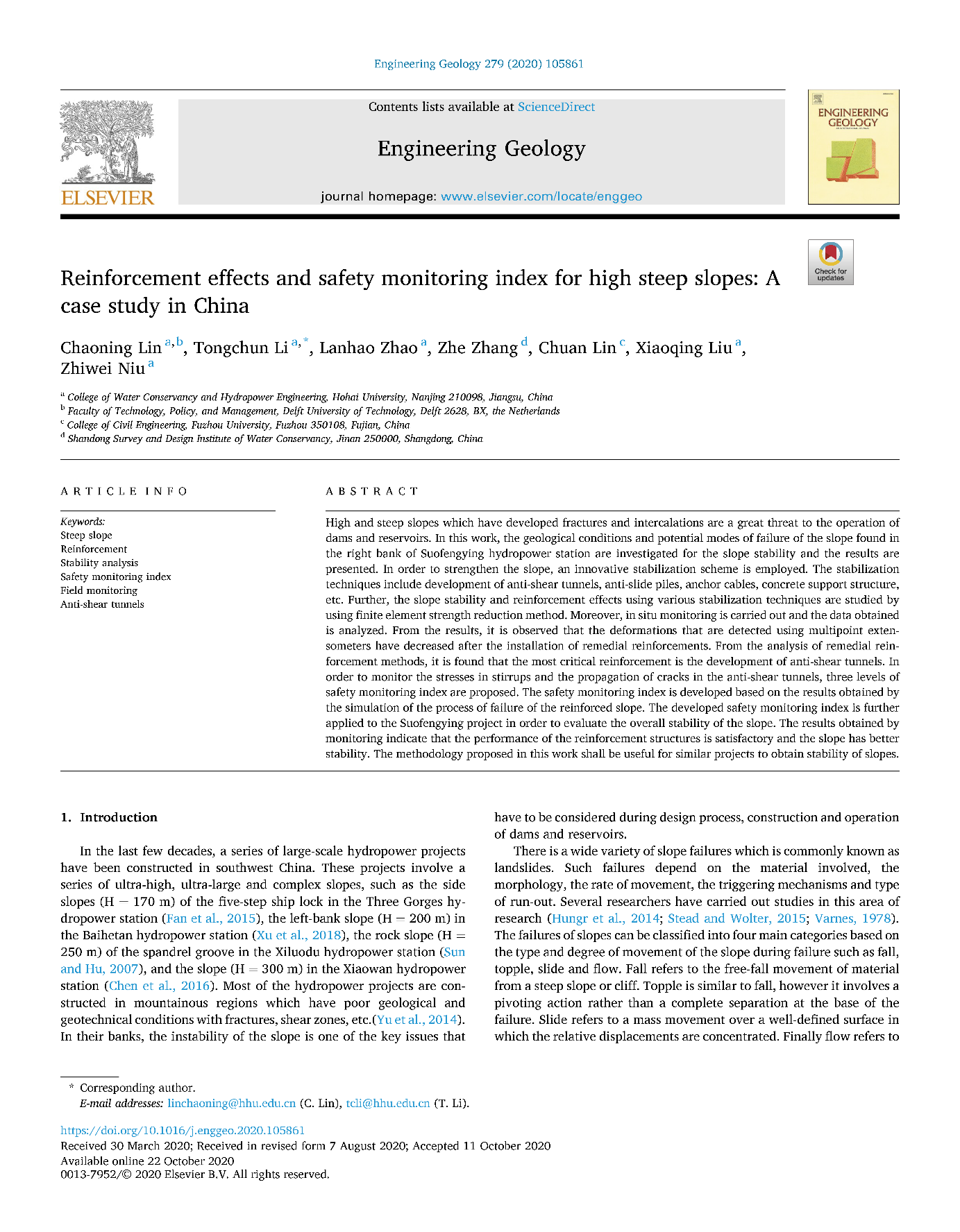 近日,我院李同春教授研究团队在岩土工程类权威期刊《Engineering Geology》(开云电竞网A类期刊,中信所1区,影响因子4.779)上发表题为:“Reinforcement effects and safety monitoring index for high steep slopes: A case study in China”的研究论文。