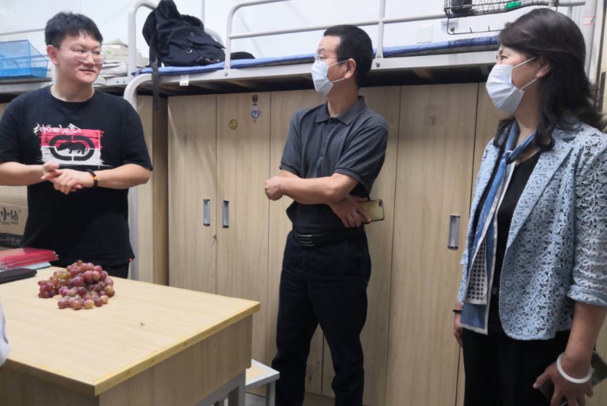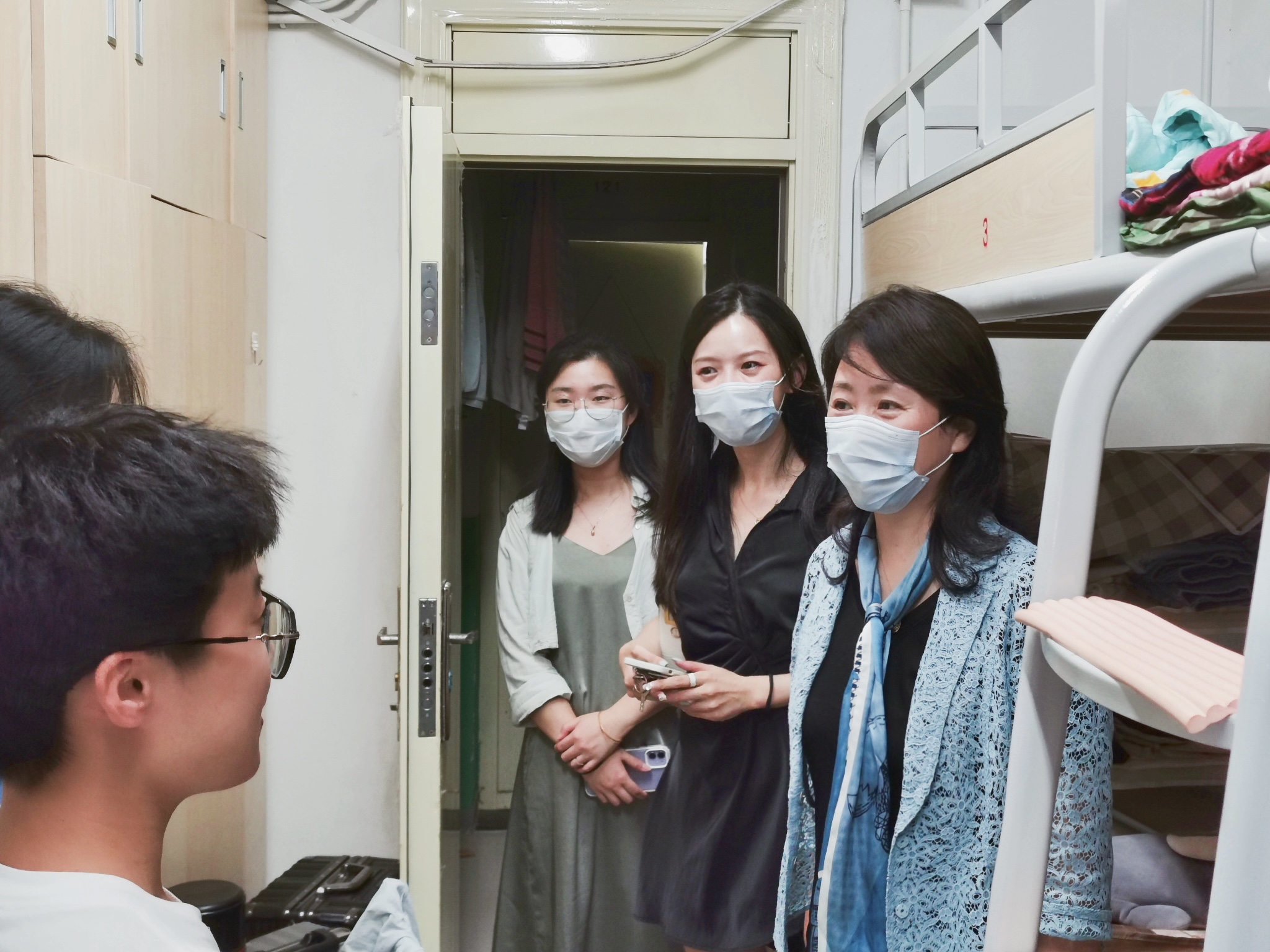22日,老生返校当天下午,我院党委书记娄健、院长王媛、副院长王建、党委副书记王方来到西康路校区学生2舍、8舍、新疆馆,走访慰问已返校的2018级、2019级本科生。2018级辅导员姜帆、2019级辅导员帅雨婷陪同走访。