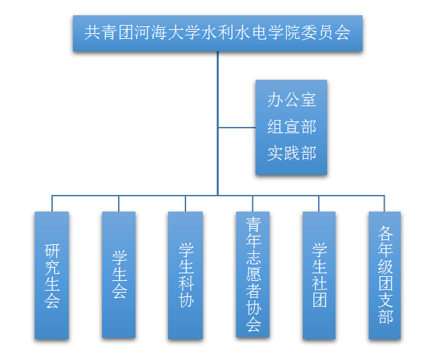 水利水电学院团委委员会设书记1名,副书记2名,委员若干。下设三个部门,分别是:办公室、组宣部、实践部,各部门设部长1人,副部长1-2人。院团委负责学院研究生、本科生各年级团支部,研究生会、学生会、学生科协、青年志愿者协会4个学生组织和学生社团。