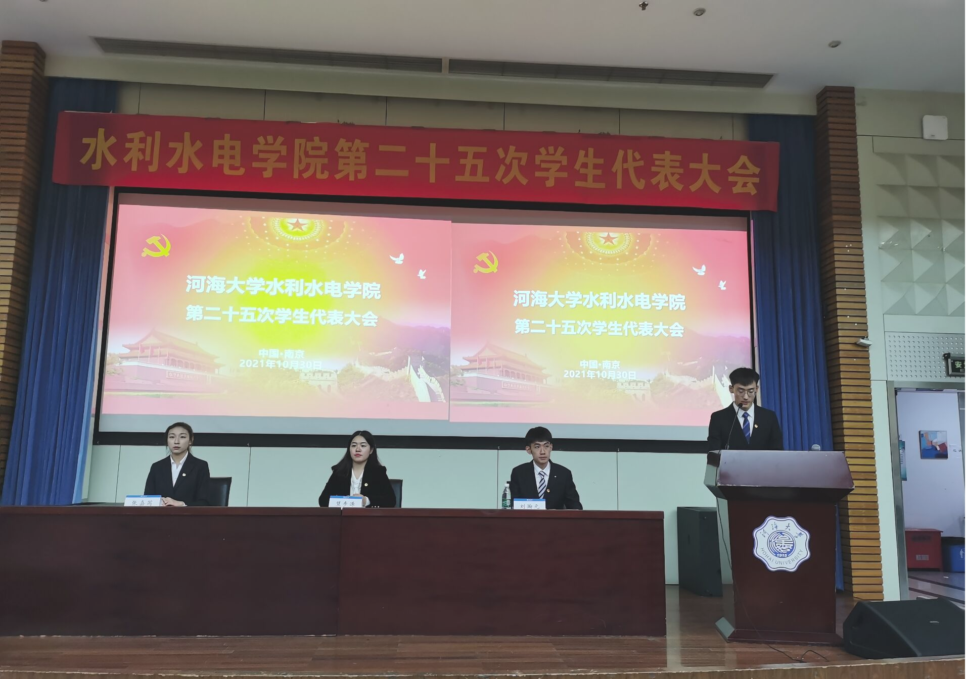 10月30日下午,水利水电学院召开第二十五次学生代表大会。伴随着庄严的国歌,大会拉开了帷幕。水利水电学院团委书记笪步源、校学生会主席团成员刘瀚元、院学生会主席张嘉芮出席会议,180名学生代表参加会议。