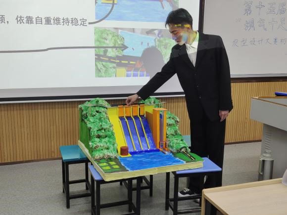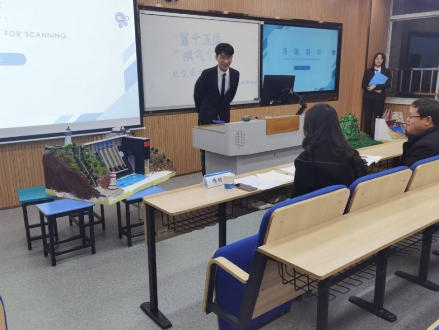 参赛选手按照抽选顺序依次上台答辩,展示团队精心制作的大坝模型,详细讲述大坝的设计背景、制作过程、工作原理及创新点。有的作品考虑雾化问题,巧设装置消减泄洪雾化;有的作品为了能源最大化利用,创新性地设计光伏板坝体;有的作品对消能问题深入研究,巧用二冲孔消能;还有作品注重发展旅游业,在大坝景观上深下工夫。部分作品还在现场进行了三维模型动画展示,令评委和现场观众眼前一亮。