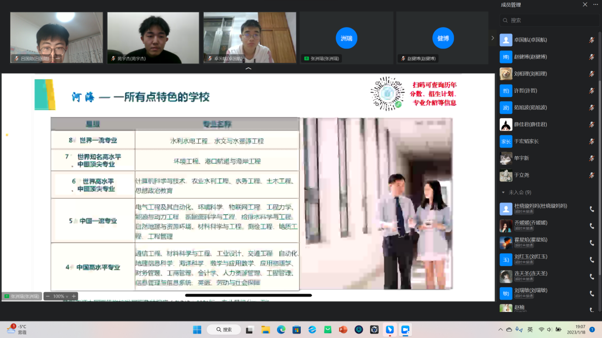 在包头市第九中学,实践团于钉钉线上网络直播平台顺利召开宣讲会。会议得到了母校的学生及家长的广泛关注,很多学生、家长在直播间聆听河海故事,了解河海文化。同时,在宣讲过程中,不少家长和同学针对自身目前情况向实践团队成员提出自己的疑虑,实践团成员都一一作出解答,并针对“专业选择”、“职业规划”、“发展方向”、“就业前景”等多个关注度较高的问题进行了更为详细的解答。宣讲活动得到了学生家长和校方的双重肯定,开云电竞网的水之子们真正将宣传教育落到实处。