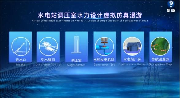 “水电站调压室水力设计虚拟仿真实验”课程通过实验设计凸显水利水电行业和学科发展的前沿问题,突破水电站引水发电系统原型实验和环境条件的限制,基于虚拟现实技术营造栩栩如生的仿真场景,实现身临其境般的参观学习和真实般的操作体验;实验融合数值计算和3D仿真,设计理论学习、实验认知、基本实验、研究探索实验和实验报告共5个模块15个交互步骤,并辅以实时数据、统计表格、动态曲线和虚拟表计,实现可视化的调压室水力设计基本实验和研究探索实验,涵盖高危和不可逆的调压室运行报警工况,场景逼真、技术先进。