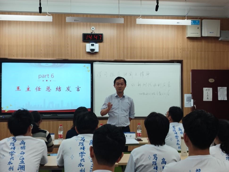 王方对本次主题班会的形式和内容表示高度赞扬,并就《纪念张闻天诞辰120周年》、《论青年的修养》两篇文章中的事迹精神与学生进行交流分享。他指出,班级同学要充分学习贯彻习近平新时代中国特色社会主义思想,将张闻天精神融入个人的学习和生活中去,一要信仰坚定、对党忠诚,牢记初心使命,坚定不移为实现既定目标而奋斗。二要坚持真理、修正错误,勇于直面问题,勇于自我批评;三要深入实践、实事求是,切实提高解决实际问题的能力和水平;四要一心为民、廉洁奉公,为水利事业发展贡献水电学子的智慧和力量。