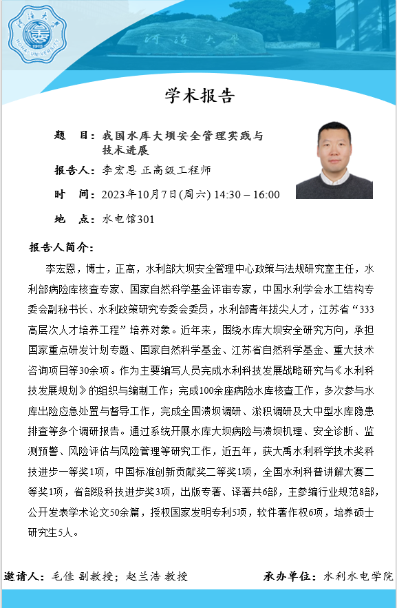 邀请人:毛佳 副教授 赵兰浩 教授 承办单位:水利水电学院