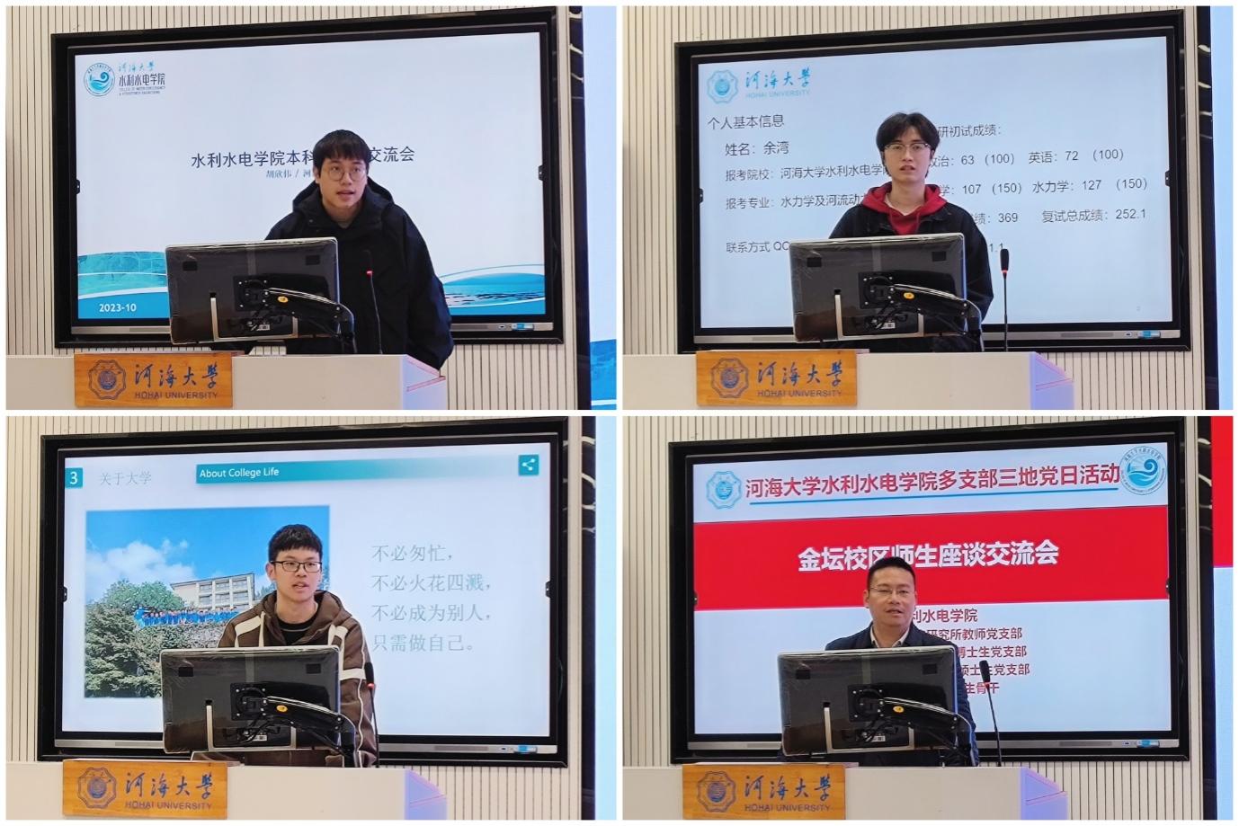 为推动学习贯彻习近平新时代中国特色社会主义思想主题教育走深走实,扎实推进“我为师生办实事”系列活动,11月11日下午,我院水力学及河流研究所教师党支部赴金坛校区开展多支部联合党日活动,与水力学及河流动力学博士生党支部金坛校区成员、2023级硕士生党支部、22级本科生代表座谈交流。师生座谈交流会由教师党支部书记闫静主持,分为竞赛颁奖、学科和创训介绍、保研考研经验分享、师生互动4个环节。