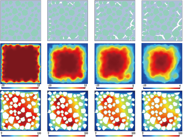 寒区混凝土内部冻裂劣化对混凝土耐久性和水工建筑物的安全影响较大。在改进的多场耦合物质点法(MPM)的框架下(如图1),本文研究了混凝土在冻融作用下孔隙水相变引起的细观层面劣化机理:1.考虑由砂浆、界面过渡区(ITZ)和骨料组成的混凝土细观结构,提出了ITZ-embedded方法模拟物质点法中热交换和力学模拟的不连续性;2.通过引入液相分数参数,将相变与应力演化之间的关系纳入MPM本构模型;3.采用分步法(fractional step)和半隐式(semi-implicit scheme)求解孔隙水相变过程中孔压分布,提高计算效率。本文结果(如图2)证明了提出的多场耦合MPM方法在模拟冻融作用下混凝土内部裂纹出现和扩展的数值可行性。