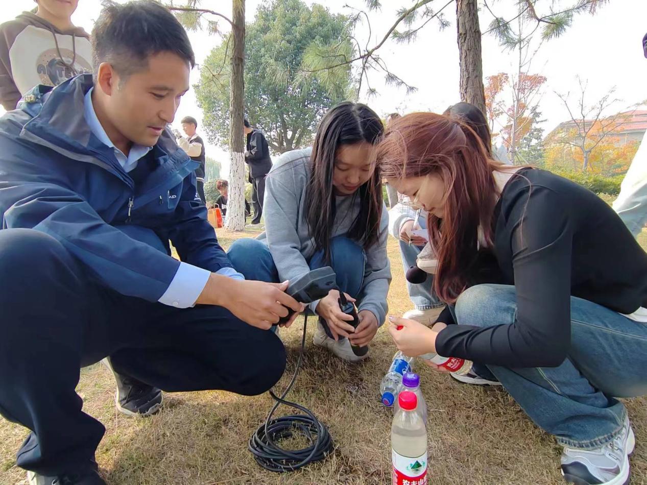 本次活动对钱资湖北岸约2 km范围内进行了水样采集与测试,并开展了湖畔公园的志愿环保行动。活动中,同学们分为8个小组,分区域对钱资湖及附近水域的水样进行采集,同步记录采样点编号、经纬度、时间等信息,并使用专业仪器现场测量水样的温度、电导率值,pH值等指标。同时,同学们对各自区段内河岸和岸上湿地公园的环境进行了清理保护活动。