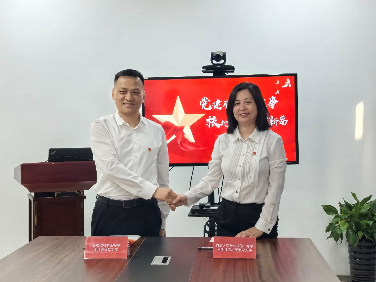 为深入贯彻党的二十大关于加强基层党建引领的精神和习近平总书记关于基层党建的重要指示,发挥学生社区功能型党支部的基层党组织战斗堡垒作用,加强校地合作,10月26日,开云电竞网常州校区18号楼学生社区功能型党支部与新城控股商业管理金坛吾悦党支部开展校企党建共建活动暨党建结对共建合作签约仪式。开云电竞网常州校区18号楼学生社区功能型党支部第一书记、学生工作处副处长、常州校区学生工作办公室主任潘静,18号楼学生社区功能型党支部书记姜帆、支部委员及学生入党积极分子代表,新城控股集团(上海)党委副书记、金坛吾悦广场总经理黄国锋,金坛吾悦党支部书记赵琰、支部委员参加活动。