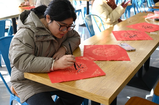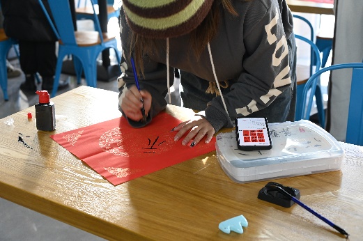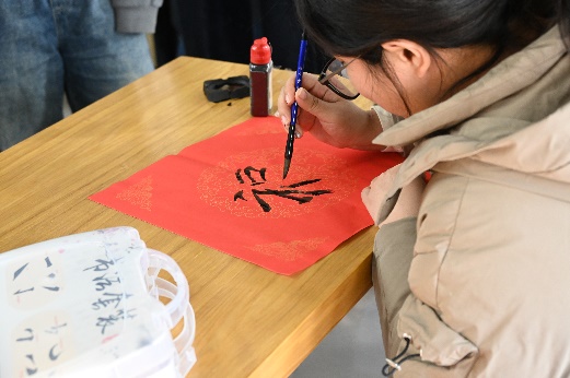 把握“亲手”的力量,书写冬至的一张祝福。各班擅长书法的同学纷纷提笔,在现场临摹出了20张写有福字的书法作品,对书法感兴趣的同学也参与其中,在纸张上写出与冬至相关的诗词,呈现出冬至的热闹景象。