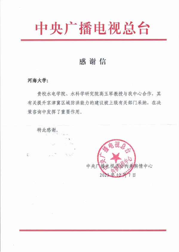 我院长三角洪涝旱灾害防御研究室主任高玉琴教授接受了中央广播电视总台内参舆情中心的采访,谈论了蓄滞洪区建设平原型水库的注意点及提升京津冀地区防洪能力的建议,被上级有关部门采纳,为决策咨询提供了重要的技术支撑。