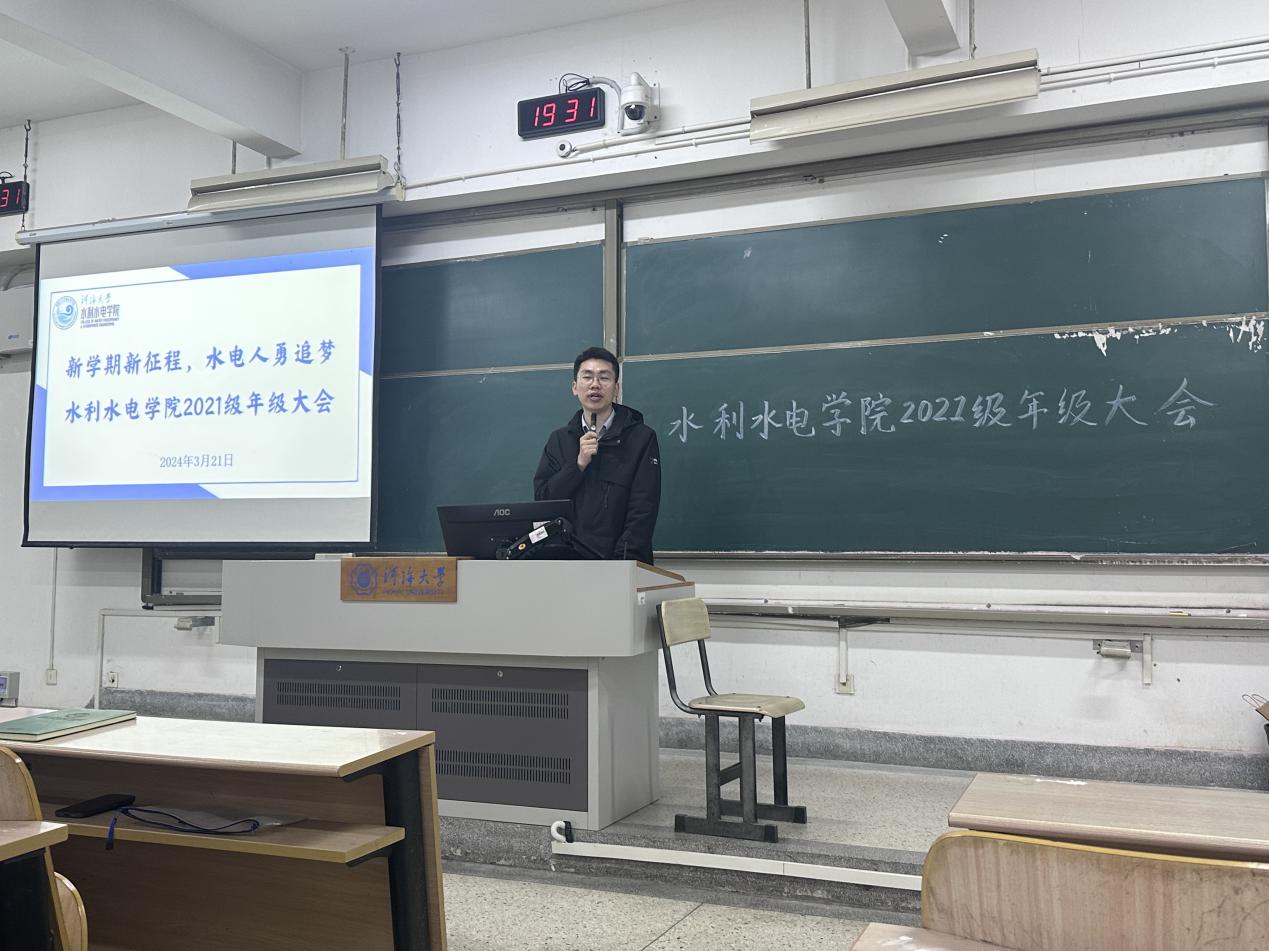 为帮助大三年级学生充分认识职业生涯发展的重要意义,把握关键时期,展示优良学风,树立正确择业就业观。3月21日,我院2021级本科生召开“新学期新征程,水电人勇追梦”主题年级大会,班导师沈雷、詹泸成受邀出席,2021级全体本科生参会,辅导员侯开智主持会议。