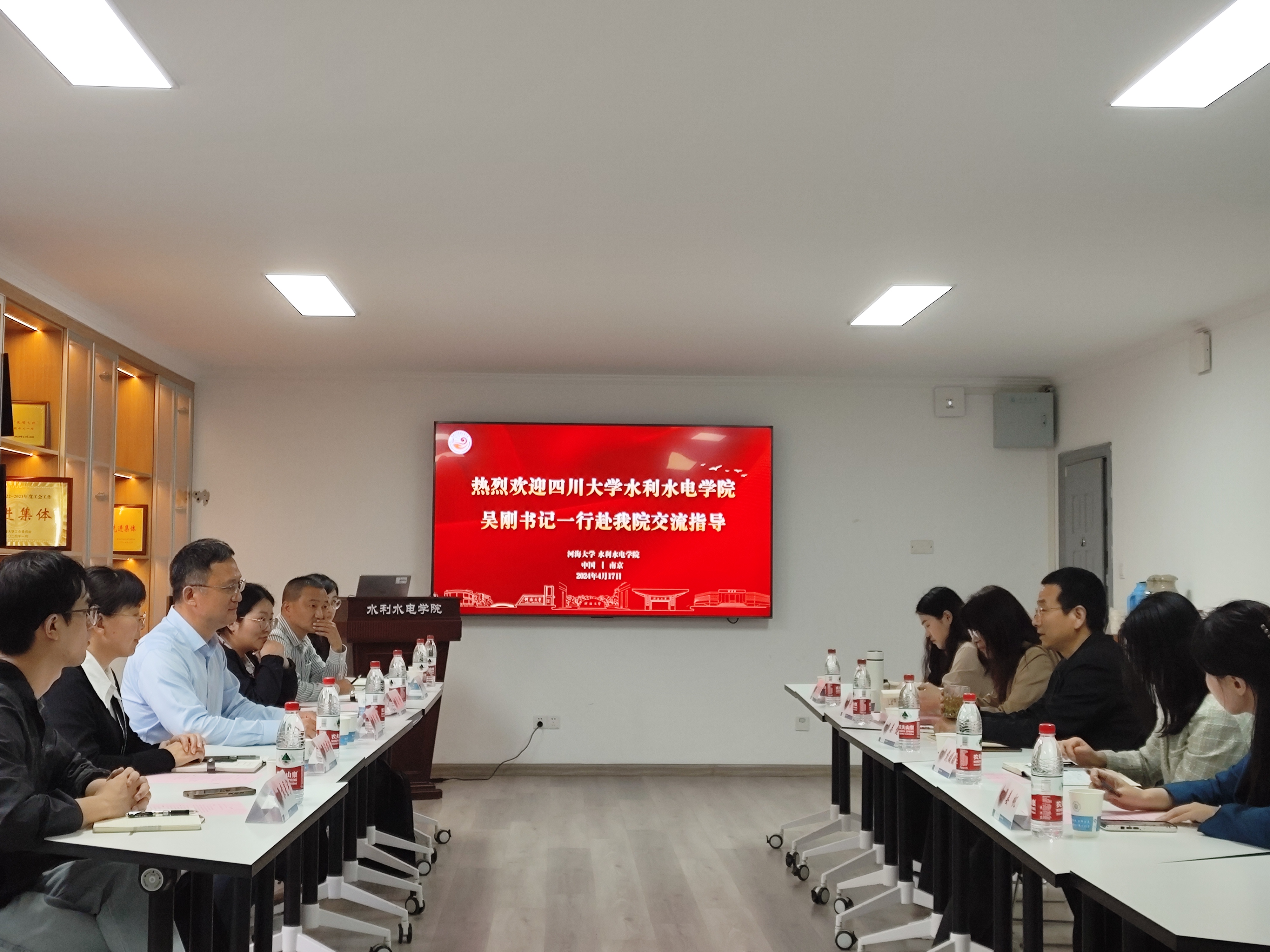 4月17日,四川大学水利水电学院吴刚书记一行前来我院交流指导。学院党委书记娄健出席并主持座谈会。