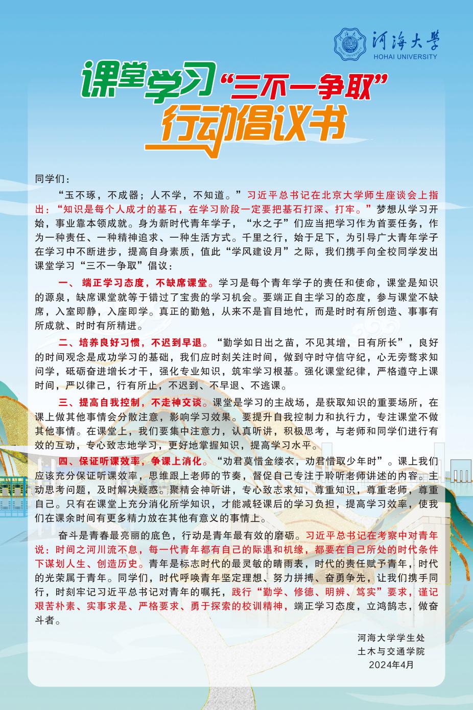 为进一步加强学风建设,营造良好的育人环境,我院根据学风建设月总体要求,认真贯彻“三不一争取”行动倡议有关内容,在思想上引领同学们充分发挥课堂作用,培养学生学习主观能动性和认真的学习态度,自发承诺并真正做到“在课堂上培养良好的自控能力,不缺席、不迟到早退、专注课堂,不做与课程无关的事情,争取最大限度把握课堂效率,在课堂中消化更多课程内容”。