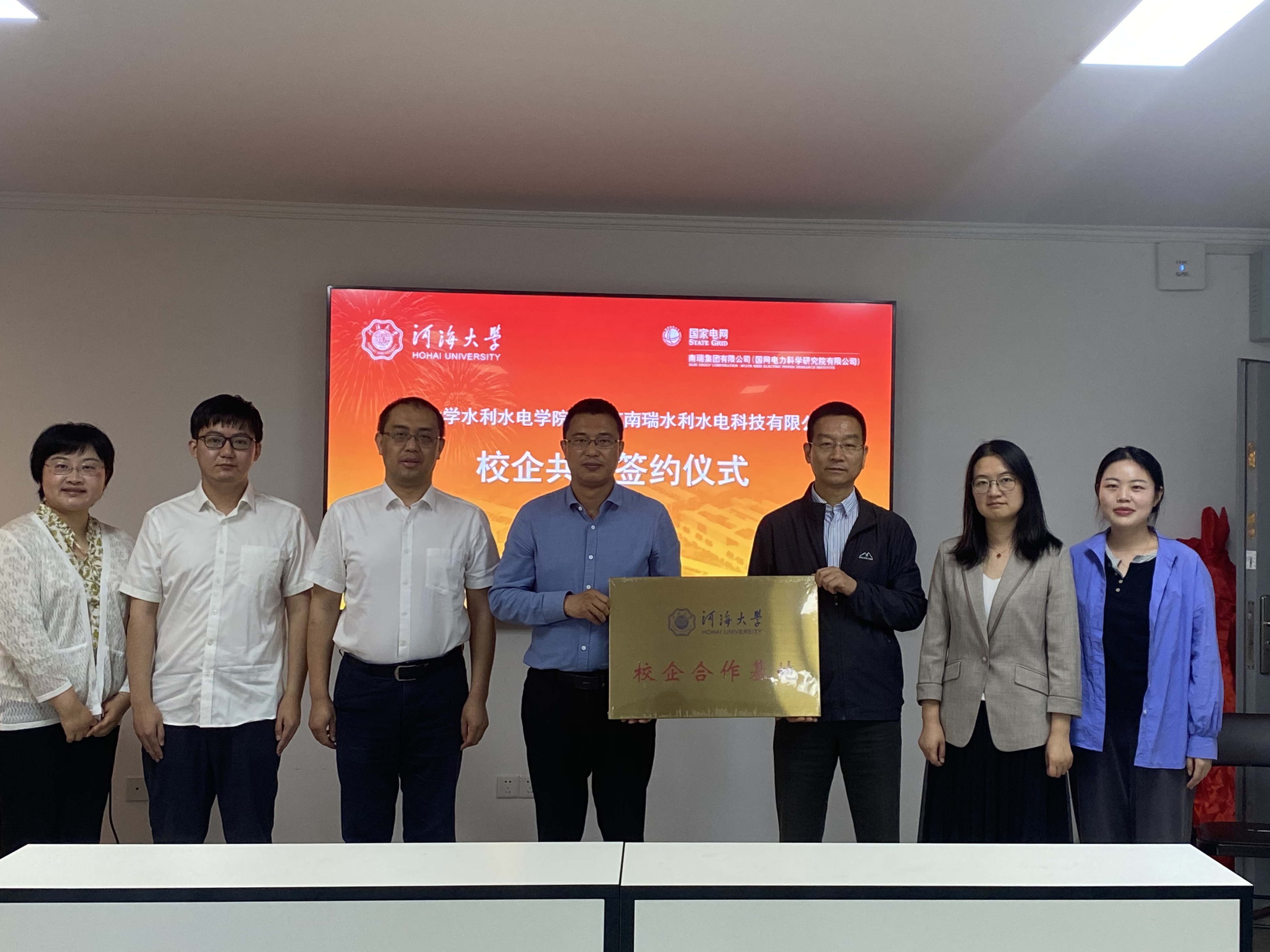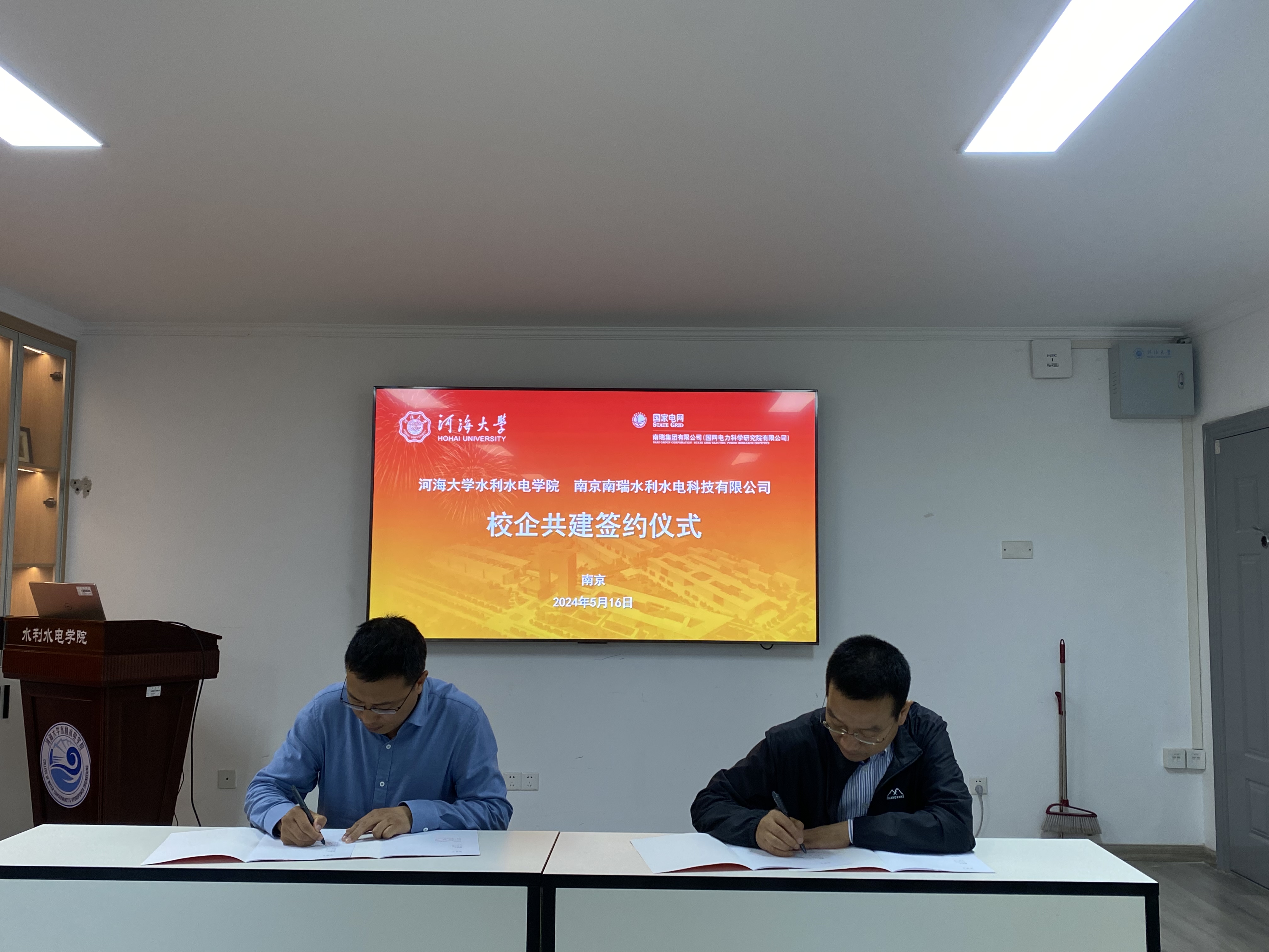 在与会人员的共同见证下,我院与南瑞水利水电科技有限公司签订校企共建框架协议并为“校企合作基地”揭牌。