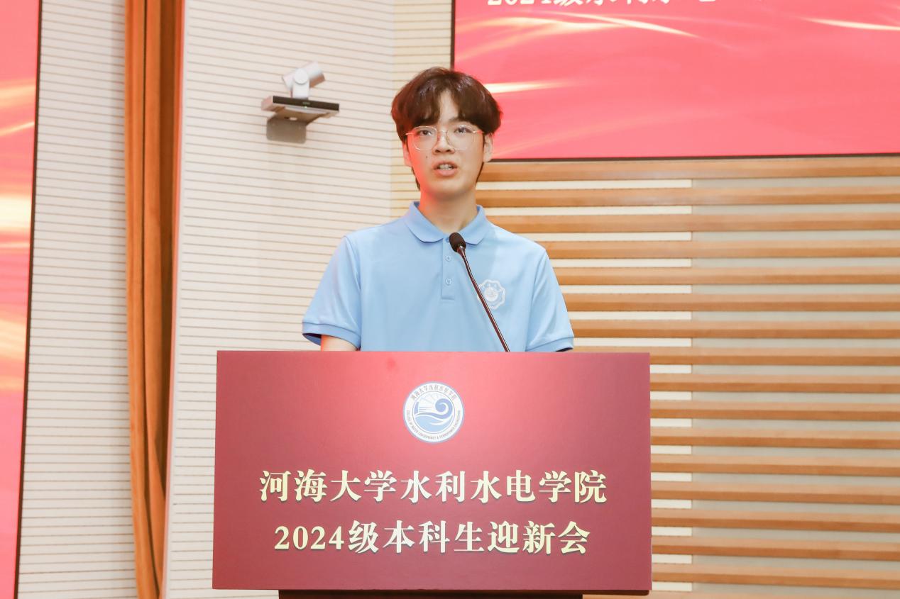 新生代表2024级水工专业毛思源同学代表全体新生同学向老师致以教师节诚挚的祝福,并讲述自己在高考备考、填报志愿、招生录取、初入校园等不同阶段的感受变化,他表示把握当下、规划未来要做到保持热情、拓展视野、不忘初心,以无悔的青春与同学们并肩前行,发扬水电精神。