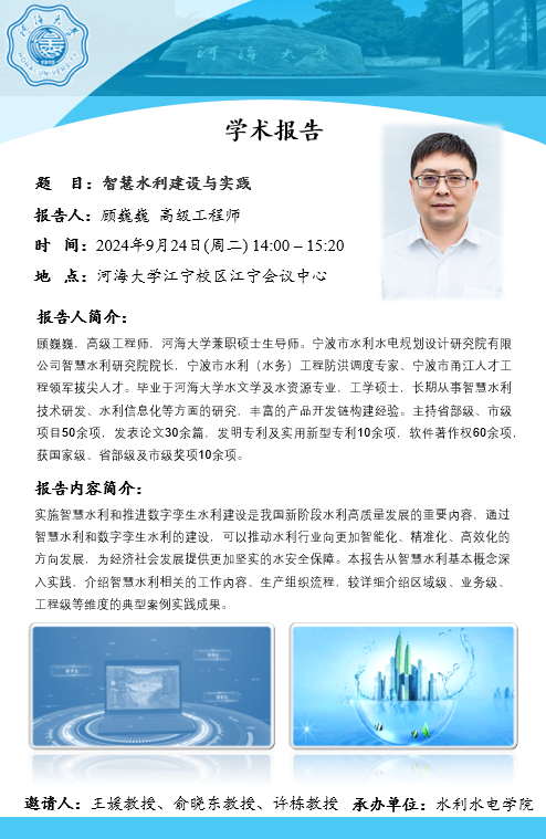 学术报告| 智慧水利建设与实践(报告人:顾巍巍,宁波市水利水电规划设计研究院有限公司)