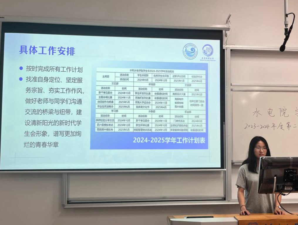 首先由学生会各部门负责人进行述职。文艺部、文宣部、外联部、权益部、体育部、学习部的部门负责人依次作述职报告,以“水文化”系列活动、院体育文化节、乐水学堂、“新生杯”系列活动、“河海杯”系列比赛等学生会品牌活动为切入点,向老师和主席团汇报了各部门活动开展上的具体成效,总结了所在部门的不足之处,提出了部门未来的工作展望。